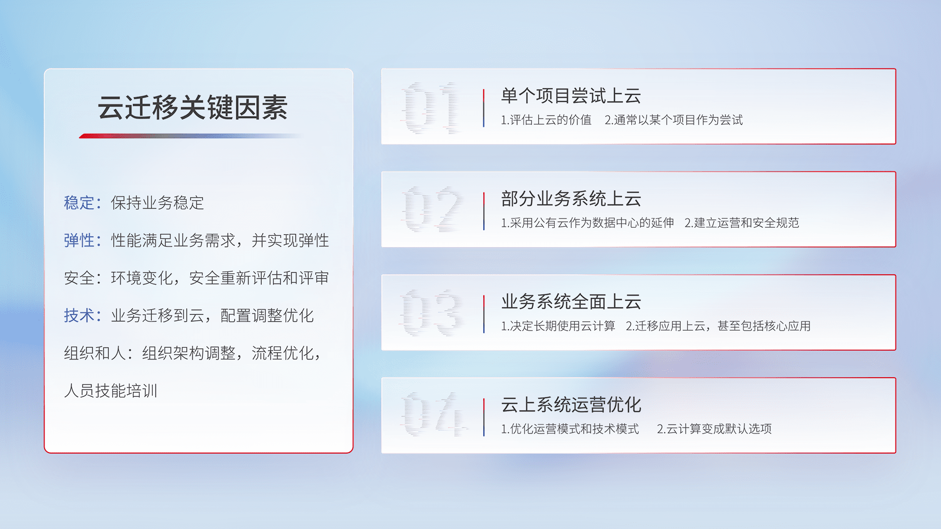 结合实际业务,,,从规划设计、、、、云平台选型、、、、云原生改造、、、、数据迁移、、、集成交付,,,迁移全过程为客户识别最佳上云路径,,做好风险识别管理,,,,设计网络架构、、、、身份权限、、、、安全审计合规、、、、操作审计、、日志审计、、监控告警策略、、、多站点容灾设计等,,对云上基础设施进行整体规划,,,提升IT治理水平,,以满足弹性、、、高可用、、、、高性能的需求。。。。
